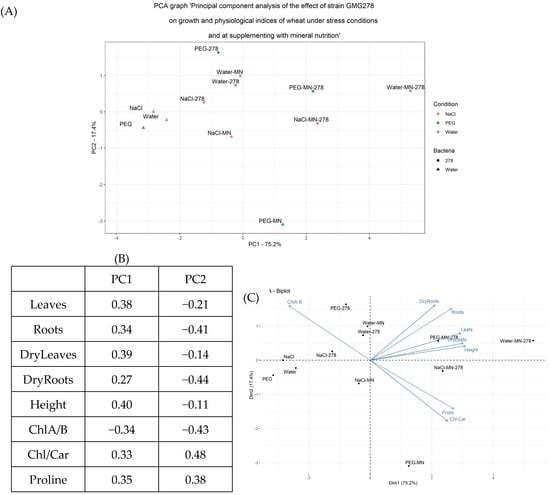 Principal component analysis of the effect of strain GMG_278 on growth and physiological indices of wheat under stress conditions and at supplementing with mineral nutrition. Legend (MN—mineral nutrition, 278—microbial fertilizer, NaCl—watering with 1% NaCl solution, PEG—watering with 10% PEG solution). (A) PCA plot, (B) the contribution of indicators to the main component, (C) Redundancy analysis (RDA).
