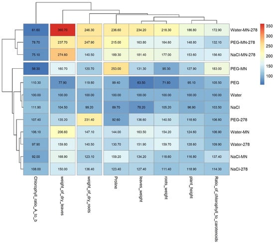 Heat map of changes in the morphological and physiological characteristics of wheat grown under stress conditions and at supplementing plants with mineral nutrition and the GMG_278 strain. Legend (MN—mineral nutrition, 278—microbial fertilizer, NaCl—watering with 1% NaCl solution, PEG—watering with 10% PEG solution).