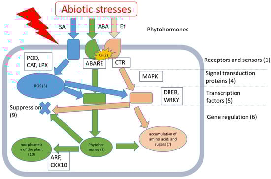 Plant adaptation to environmental changes requires a new state of cellular homeostasis, which is achieved through a delicate balance between several pathways. Plant cells receive stress signals through various sensors, and the signals are transmitted by various signaling pathways, which involve many second messengers, plant hormones, signal transducers, and transcription regulators [20] (Figure 7). Diagrams of the changes in plant gene expression under stress conditions are shown in Figure 8.
