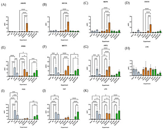 Diagrams of the dependence of gene expression involved in response to stress factors in wheat grown under drought and salinity conditions on introducing GMG_278 strain. Legend (MF—mineral fertilizer, NaCl—watering with 1% NaCl solution, PEG—watering with 10% PEG solution). (A) gene ABARE, (B) gene WKY26, (C) gene MAPK, (D) gene CKX10, (E) gene DREB, (F) gene WKY71, (G) gene ARF2, (H) gene CTR, (I) gene POD, (J) gene CAT, and (K) gene LPX. *—p (p values) < 0.05, **—p < 0.01, ***—p < 0.001, ****—p < 0.0001.