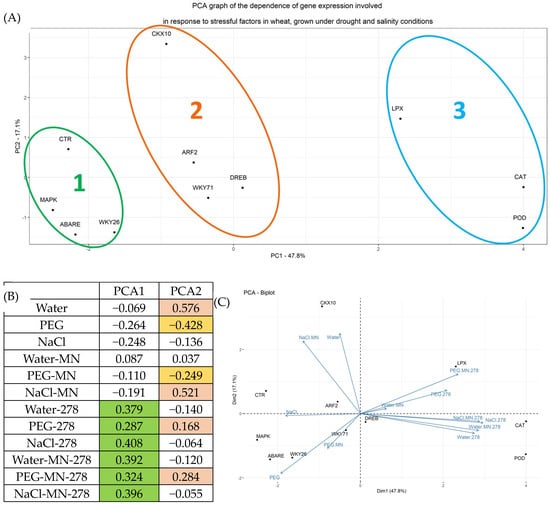 Principal component analysis of data on the expression of genes involved in response to stress factors in wheat grown under drought and salinity conditions at introducing GMG_278 strains. Legend (MN—mineral nutrition, 278—microbial fertilizer, NaCl—watering with 1% NaCl solution, PEG—watering with 10% PEG solution). (A) PCA plot, (B) the contribution of indicators to the main component. The color indicates the maximum absolute coefficients for each PSA vector. For PSA1—green, for PSA 2 two colors are used: pink for conditions that shift the gene expression level up along the PSA2 axis, yellow—down along the PSA2 axis. (C) Redundancy analysis (RDA).