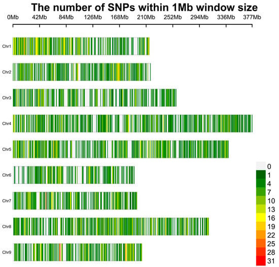 The distribution of 7136 high-quality SNPs across the 9 Lactuca sativa chromosomes. The horizontal axis represents the chromosome length in Mb. Different colors correspond to SNP density.