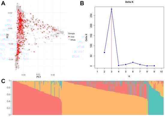 The development and population structure analysis of the lettuce core collection. (A) Principal component analysis (PCA) of the core collection. The red dots represent accessions in the core collection, while the gray dots represent accessions not included in the core collection. (B) Delta K values for different assumed population numbers (K) in the STRUCTURE analysis. (C) The inferred population structure for K = 3. Individual membership coefficients were sorted within each cluster.