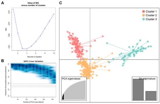 The genetic structure was further analyzed by the Discriminant Analysis of Principal Components (DAPC) using the R package adegenet [55]. The “find.clusters” function was used to detect the number of genetic clusters in the population. The best number of subpopulations in the DAPC was indicated by an elbow in the curve of the Bayesian information criterion (BIC). A cross-validation function “xvalDapc” was used to confirm the correct number of PCs to be retained and then the analysis was rerun with this number.
