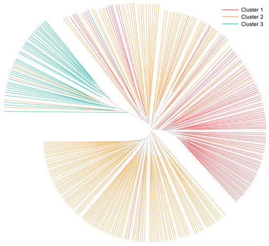 The grand mean values for the number of different alleles (Na) and the number of effective alleles (Ne) across the three subpopulations were 1.96 and 1.45, respectively (Table 5). The mean values for the entire population in terms of the expected heterozygosity (He), the unbiased diversity index (uHe), and Shannon’s information index (I) were 0.28, 0.28, and 0.43, respectively. Among the three clusters, Cluster 2 exhibited the highest genetic diversity, as indicated by its slightly higher values for the He (0.29), uHe (0.29), and I (0.44), compared to Clusters 1 and 3. The fixation index (F), which measures the degree of inbreeding within each population, ranged from 0.77 to 0.79, indicating a consistently high level of genetic structuring across the clusters.