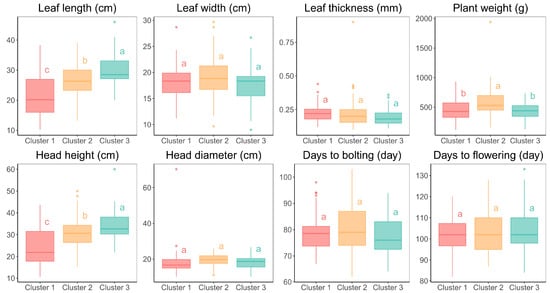 Boxplots showing the variation in quantitative agro-morphological traits across clusters. Different letters indicate significant differences between groups (p < 0.05).
