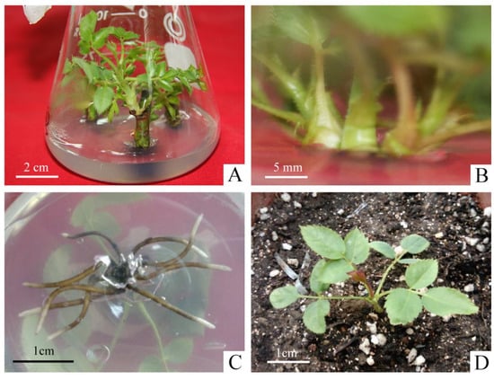 Micropropagation process of R. hybrida ‘Carola’. (A) Axillary buds produced from nodal segments without petioles in primary medium, (B) Proliferation of shoots in proliferation medium, (C) Roots produced in rooting medium, (D) Rooted plants were transplanted to the greenhouse after hardening-off culture.