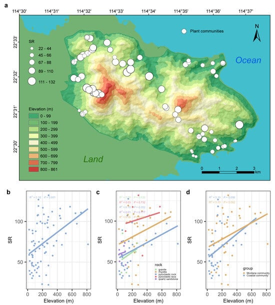 Spatial distribution pattern of species richness of plant communities in Qiniangshan Mountain and its response to elevation gradient. (a) Spatial distribution pattern of species richness, the size of the circle represents the SR of each plant community; (b) Response of species richness to elevation gradient; (c) Response of species richness on different bedrock to elevation gradient; (d) Response of species richness of montane communities and coastal communities to elevation gradient.