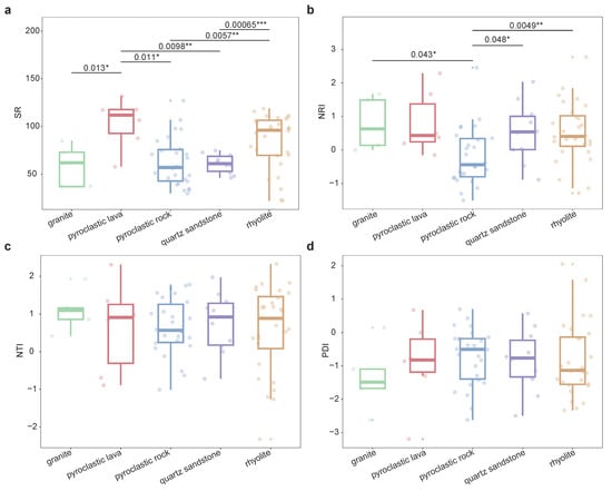 The differences in species richness, phylogenetic structure among types of bedrock. (a) Species richness; (b) NRI (Net Relatedness Index); (c) NTI (Nearest Taxon Index); (d) PDI (Phylogenetic Diversity Index); Granite, rhyolite, pyroclastic rock, pyroclastic lava are volcanic bedrocks, and quartz sandstone is a non-volcanic bedrock; T-test was used to compare the component differences. There is a significant difference between the two sets of data marked with *, * means p < 0.05, ** means p < 0.01, *** means p < 0.001.