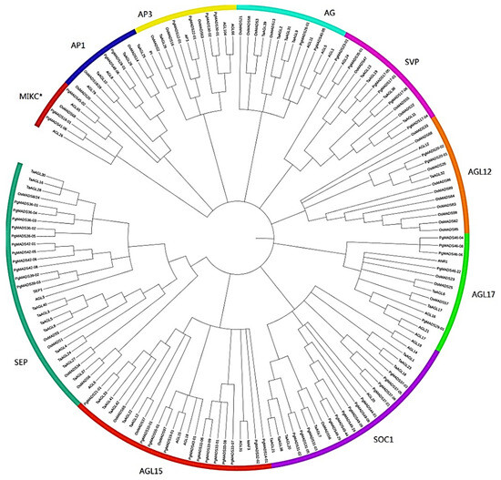 - Becker, A.; Theißen, G. The major clades of MADS-box genes and their role in the development and evolution of flowering plants. Mol. Phylogenetics Evol. 2003, 29, 464–489. [Google Scholar] [CrossRef]