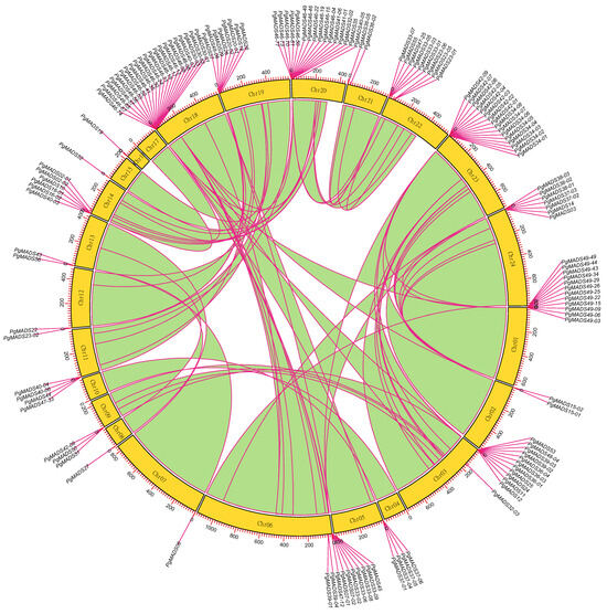One hundred and forty of 162 PgMADS gene transcripts were scattered and distributed on 21 chromosomes (Chr), and none of them were mapped on Chr04, Chr10, and Chr17 (Figure 3). Chr18 contained the highest number of PgMADS genes, with 21 genes, followed by Chr20 and Chr21, with 16 genes each. Most of the chromosomes (Chr02, Chr05, Chr07, Chr08, Chr09, Chr11, Chr12, Chr13, Chr15, Chr16, and Chr21) contained fewer than 5 genes per Chr, while Chr6, Chr14, Chr19, Chr22, and Chr24 contained 5–10 genes per Chr. The enrichment regions showed a relatively high density on Chr01, Chr03, Chr18, Chr20, and Chr23, having more than 10 genes each. The length and number of genes distributed on chromosomes varied within the PgMADS gene family. Chr06, with a gene (PgMADS45) and the longest length of 1731 bp, aligned with ten genes, while Chr20, with the shortest alignment length of 237 bp (PgMADS32-02), contained 16 genes, and Chr18, with 387 bp in length (PgMADS46-13), aligned with 21 genes. PgMADS genes were aligned in two clusters on Chr06, with eight genes on cluster one and two genes on cluster two within 200 bp length. PgMADS genes were localized on various chromosomes indicating the possibility of various functions.