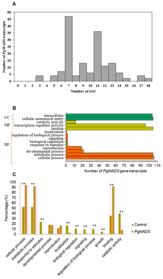 Functional categorization of PgMADS gene transcripts based on gene ontology (GO). (A) GO mapping distribution of 162 PgMADS transcripts. (B) Distribution of PgMADS transcripts for GO enrichment based on the biological process (BP), molecular function (MF), and cellular component (CC) at Level 2 and a p-value = 1. (C) Subcategories (Level 2) in which the PgMADS transcripts are involved and their enrichments. The GO term categorization of the transcripts expressed in 14 tissues of the 4-year-old plant used for the identification of the PgMADS transcripts as the background control for the enrichment analysis. ** Significant at p ≤ 0.01.