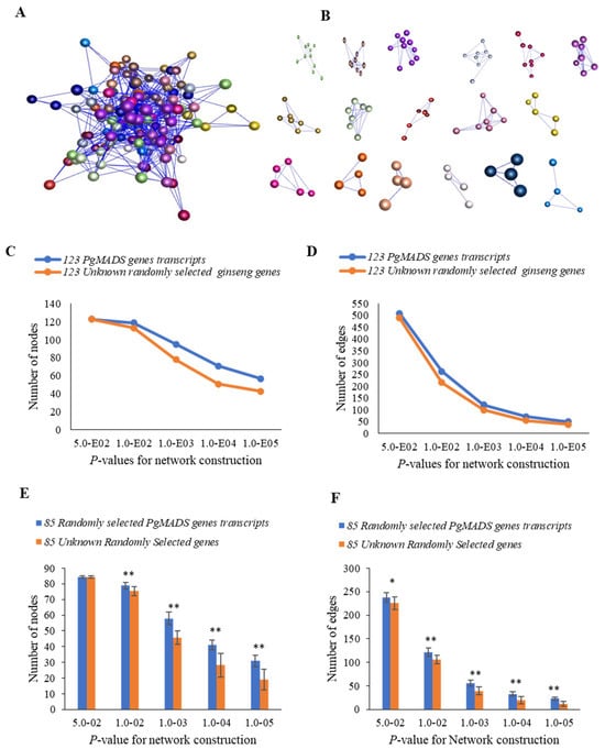 A co-expression network among PgMADS genes was formed in the 4-year-old roots of 42 cultivars. Due to expression levels of 39 of the 162 PgMADS gene transcripts being zero in all 42 cultivars, 123 gene transcripts were used for co-expression network construction. When p ≤ 5.0 × 10−2 was set, the 123 PgMADS transcripts formed a co-expression network with a total of 509 edges and 17 clusters (Figure 5A,B). When comparing the interaction network formed by the PgMADS gene transcripts to that by the randomly selected unknown ginseng genes, the number of the nodes and edges of the network formed by the PgMADS genes was higher than that of the co-expression network of randomly selected genes with a decreasing p-value (Figure 5C,D). There was a significant difference between PgMADS genes and randomly unknown selected genes at almost all the p values (Figure 5E,F). The results suggest that there is a closer connection between PgMADS genes than the random unknown genes.
