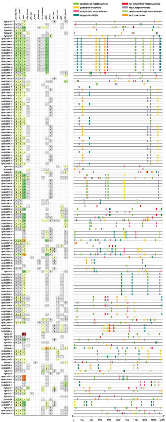 PlantCare analysis showed that PgMADS genes contained a variety of cis-acting elements, ranging from 2 to 18 cis-acting elements per gene. The PgMADS36-02 gene contained the lowest number of the two elements, while PgMADS39-04 contained a total of 18 cis-acting elements (Figure 7). The genes showed a relatively higher response to ABRE, MeJA, and MBS elements. PgMADS24 contained the highest number of five MBS promoter elements followed by the transcripts spliced from PgMADS49 and PgMADS37 genes. The ABRE element was comparatively rich within a total of 103 PgMADS genes and relatively richer in the PgMADS29 gene that contained 8 ABRE elements, followed by PgMADS16-02 and PgMADS16-01 with 6 ABRE elements each. In addition to ABRE element, 121 PgMADS genes contained MeJA responsiveness elements (TGACG and CGTCA motifs). A total of 84 genes were responsive to the drought inducibility element, and a limited number of PgMADS genes showed responsiveness to auxin elements.
