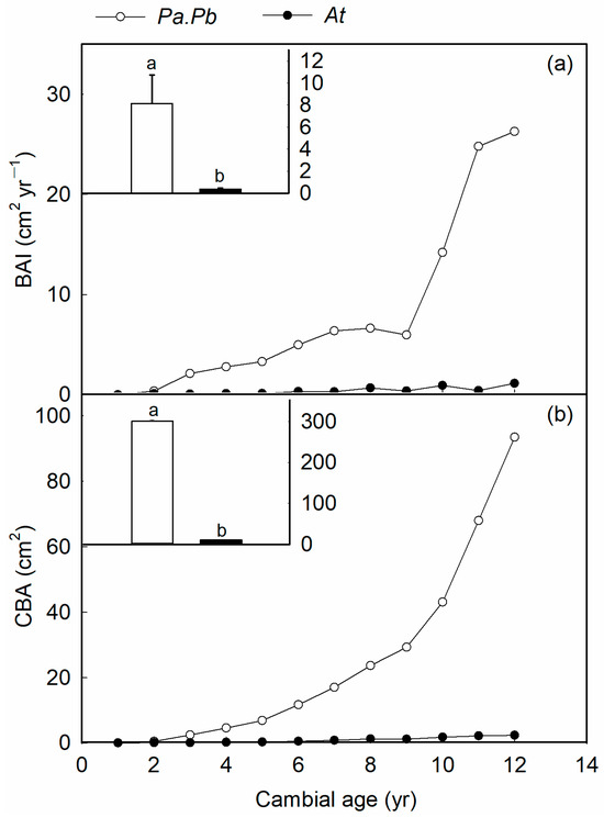 Comparison of radial growth of Populus alba L. × P. berolinensis Dippel (Pa.Pb) and Acer truncatum (At). (a) The basal area increment (BAI, cm2 yr−1) from cambial ages 1–12 years; (b) the cumulative basal area (CBA, cm2) at a cambial age of 12 years for each species (p < 0.01, t test). The BAI and CBA are mean values calculated from treecore analyses of all sampled trees (n ≥ 15). Each circle or dot represents the mean of four replicates of Pa.Pb and At, respectively. In both panels, different lowercase on top of the bars represent significant differences between the two species.