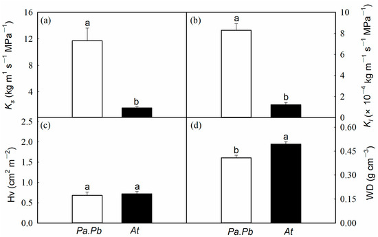 Comparisons of (a) sapwood hydraulic conductivity (Ks), (b) leaf-specific conductivity (Kl), (c) Huber value (Hv), and (d) wood density (WD) between Populus alba × P. berolinensis (Pa.Pb) and Acer truncatum (At). Error bars show 1 SE (n = 6). In each panel, different letters on top of the bars represent significant differences between the two species (t test, p < 0.05).