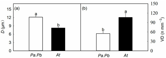 Comparisons of (a) vessel diameter (D), (b) vessel density (VD) between Populus alba × P. berolinensis (Pa.Pb) and Acer truncatum (At). Error bars show 1 SE (n = 6). In each panel, different letters on top of the bars represent significant differences between the two species (t test, p < 0.01).