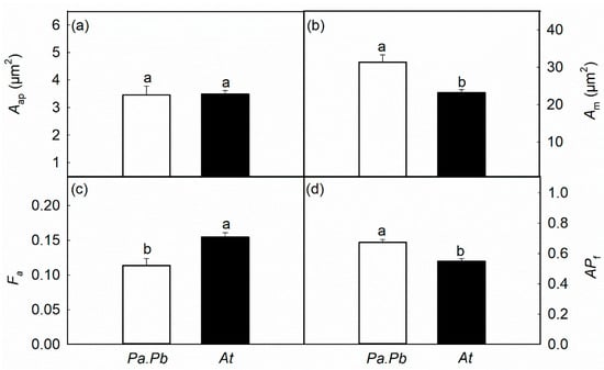 Comparisons of (a) the pit aperture area (Aap), (b) the pit membrane area (Am), (c) the aperture fraction (Fa), and (d) the pit aperture shape index (APf) between Populus alba × P. berolinensis (Pa.Pb) and Acer truncatum (At). Error bars show 1 SE (n = 6). In each panel, different letters on top of the bars represent significant differences between the two species (t test, p < 0.05).