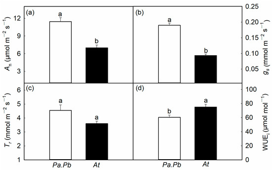 Leaf photosynthetic traits of Populus alba × P. berolinensis (Pa.Pb) and Acer truncatum (At). (a) Net photosynthetic assimilation rate (An); (b) stomatal conductance (gs); (c) sap flow transpiration rate (Tr); (d) water-use efficiency (WUEi). Error bars show 1 SE (n = 6). In each panel, different letters on top of the bars represent significant differences between the two species (t test, p < 0.05).