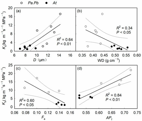 The sapwood hydraulic conductivity (Ks) in relation to (a,b) xylem anatomical characters vessel diameter (D) and wood density (WD), (c,d) the pit anatomical characters of the aperture fraction (Fa) and the pit aperture shape index (APf). Each of the circles or dots represents an individual tree of Populus alba × P. berolinensis (Pa.Pb) and Acer truncatum (At), respectively.