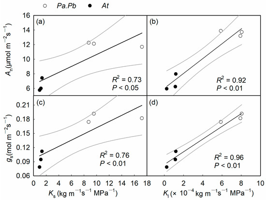 The sapwood hydraulic conductivity (Ks) and leaf-specific conductivity (Kl) in relation to the leaf photosynthetic traits (a,b) net photosynthetic assimilation rate (An), (c,d) stomatal conductance (gs). Each of the circles or dots represents an individual tree of Populus alba × P. berolinensis (Pa.Pb) and Acer truncatum (At), respectively.