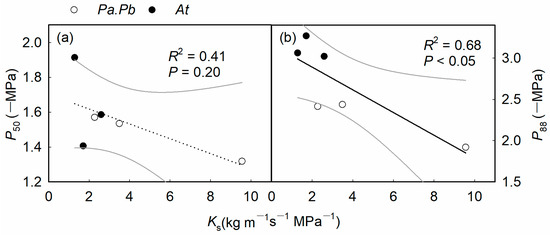 The sapwood hydraulic conductivity (Ks) in relation to cavitation resistance. (a) Xylem water potentials corresponding to 50% loss of hydraulic conductivity (P50), (b) xylem water potentials corresponding to 88% loss of hydraulic conductivity (P88). Each of the circles or dots represents an individual tree of Populus alba × P. berolinensis (Pa.Pb) and Acer truncatum (At), respectively.