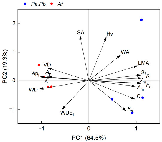 Results of the principal component analysis (PCA) of all the different species using 17 measured functional traits. Each of the red or blue dots represents an individual tree of Populus alba × P. berolinensis (Pa.Pb) and Acer truncatum (At), respectively. LA, leaf area; LMA, leaf mass per area; WD, wood density; WA, total wood area; SA, sapwood area; Ks, sapwood hydraulic conductivity; Kl, leaf-specific conductivity; Hv, Huber value; D, vessel diameter; VD, vessel density; An, leaf net photosynthetic assimilation rate; gs, stomatal conductance; WUEi, instantaneous water-use efficiency; Aap, pit aperture area; Am, pit membrane area; Fa, aperture fraction; APf, pit aperture shape index.