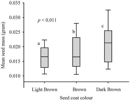One-way ANOVA results showing the mean mass of B. pirottae seeds with different colours. Means with different letters are significantly different from each other at the 0.05 significance level.