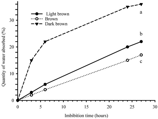Water imbibition rate of differently coloured B. pirottae seeds over time. The letters at the 27 h mark indicate the results of a one-way ANOVA test at a significance level of p = 0.05. Different letters represent statistically significant differences.