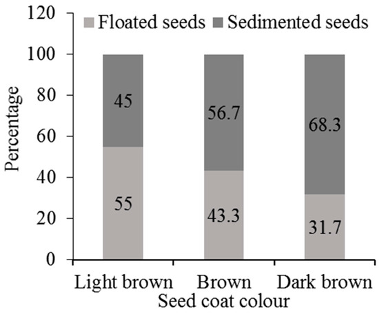 The mean water imbibition rates of the seed colour categories are presented in Figure 2. The results showed that the mean water imbibition rate of DB seeds was higher than in B and LB seeds. The one-way ANOVA result exhibited significant differences in the mean water imbibition rates among the differently coloured seeds after 27 h of soaking (p < 0.05, Figure 2). The mean percentage of floating seeds was the highest for LB seeds (55%), followed by B seeds (43.3%), and then DB seeds (31.7%) (Figure 3). However, the one-way ANOVA result revealed no significant differences in the mean percentage of floating seeds among the different seed colours of the species (p = 0.139).