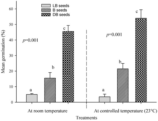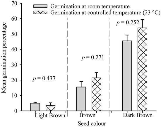 One-way ANOVA results of the mean germination percentage of differently coloured seeds at controlled and room temperatures. Identical letters indicate no significant differences at a p-value of 0.05.