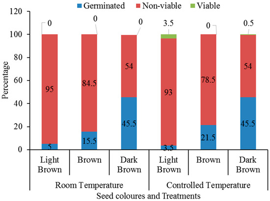 Mean percentage of germinated, viable, and non-viable seeds for different seed colours at the end of the experiment under room temperature and controlled temperature conditions.