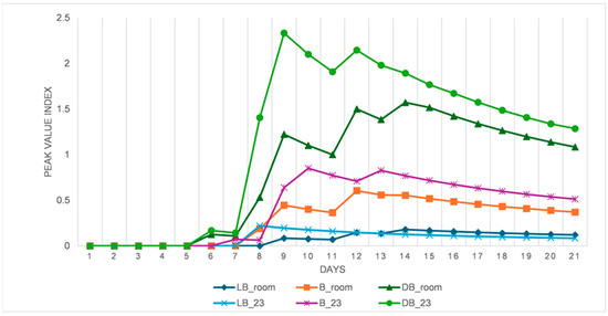 Peak value indices of B. pirottae seeds germinated at room (fluctuating) temperature and in controlled conditions at a constant 23 °C (LB—light brown seeds; B—brown seeds; DB—dark brown seeds; and room—room temperature; 23—constant 23 °C).