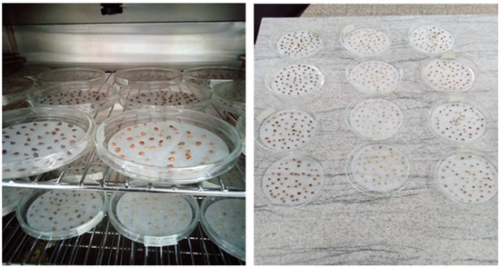 A randomised complete block design (RCBD) was used in the germination experiment. For each seed colour category (LB, B, and DB) and temperature, 200 seeds were used independently. These seeds (200 seeds) were divided into four replicates, with 50 seeds in each. Watering was undertaken daily in the morning until the end of the experiment. To prevent fungal growth in the Petri dishes, sown seeds were carefully rinsed with distilled water weekly and transferred to new and cleaned Petri dishes with a new filter paper. Germination data were recorded daily. Seeds were considered germinated when the length of the radicle was at least 2 mm. Ungerminated seeds were dissected at the end of the experiment using a sharp knife. Seeds were visually inspected after being cut, opened with a knife, and classified as either non-viable or viable based on FAO [76] criteria. Seeds were classified as non-viable if they comprised soft, decayed, or malformed embryos, and viable seeds were those with well-formed, normal-coloured endosperms and healthy embryos.
