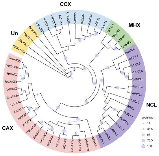 Utilizing Hmmsearch combined with BLAST search based on Arabidopsis CaCA sequences, 22 CaCA genes were identified in R. roxburghii. Phylogenetic analysis revealed that these genes can be classified into four families: nine belong to the CAX family (Rrox6G00416820, Rrox6G00416880, Rrox2G00097160, Rrox1G00011530, Rrox6G00416850, Rrox6G00416870, Rrox2G00097180, Rrox2G00093860, Rrox1G00006540), six to the NCL family (Rrox1G00048700, Rrox1G00048690, Rrox1G00048730, Rrox2G00115170, Rrox1G00048660, Rrox1G00066160), five to the CCX family (Rrox6G00389590, Rrox6G00389620, Rrox2G00146460, Rrox6G00425230, Rrox165G00437120), and two to the MHX family (Rrox7G00173680, Rrox7G00173670). Based on their homologous genes in Arabidopsis, we further renamed these genes (Figure 1, Table S1).