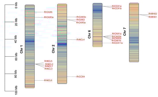 Chromosomal localization of RrCaCA genes. The chromosomal locations of the RrCaCA genes are depicted on Chr 1, Chr 2, Chr 6, and Chr 7. Genes are marked in red text to indicate their positions, with physical positions scaled by megabases (Mb) shown on the left. Chromosomal background shading represents gene density, where red indicates high gene density regions and blue indicates low gene density regions.