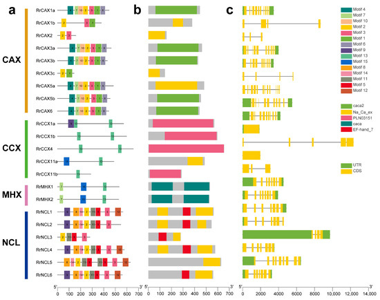 Structural motifs of RrCaCA genes. (a) MEME motifs; (b) conserved functional domains; (c) intron and exon structures.