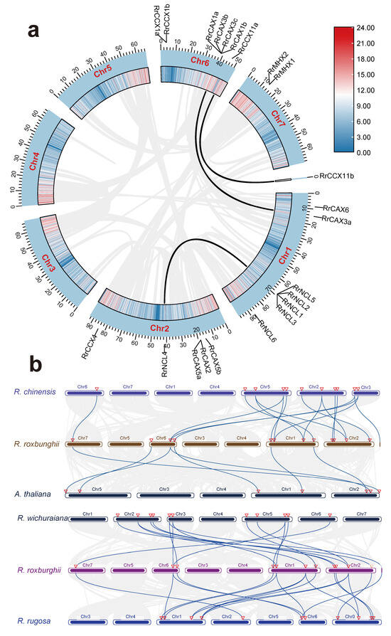 Collinearity analysis of CaCA genes. (a) Collinearity analysis of RrCaCA genes within R. roxburghii genome; (b) inter-genomic collinearity analysis among A. thaliana, R. chinensis, R. wichuraiana, and R. rugosa. Black and blue lines represent collinearity of CaCA genes.