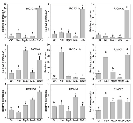 Expression profiles of RrCaCA under metal stress conditions. The qRT-PCR results normalized with the 2−ΔΔCT Ct method using GADPH as an internal reference. The experiment was performed three times with three biological replicates. Error bars represent mean ± SD. CK refers to the untreated R. roxburghii, while the other treatments include R. roxburghii subjected to 200 mM NaCl, 50 mM MgCl2, 50 mM MnCl2, and 100 mM CaCl2. Different lowercase letters indicate significant differences, as determined by one-way ANOVA followed by Tukey’s post hoc test (p < 0.05). Groups with different letters are significantly different from each other, with the letter assignments based on the results of pairwise comparisons.