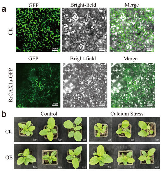 To further verify the function of RrCAX1a, known for its high responsiveness to Ca2+ stress, we analyzed its subcellular localization. The coding sequence of RrCAX1 was fused with green fluorescent protein (GFP). Transient expression in tobacco leaves revealed distinct green fluorescence on the cell membrane, confirming that RrCAX1a is localized to the cell membrane (Figure 8a). In A. thaliana, membrane-localized transporters such as AtCAX1/3 are phosphorylated and activated by Ca2+ sensor kinase modules to facilitate Ca2+ efflux and maintain cytoplasmic homeostasis [31]. The localization of RrCAX1a to the cell membrane suggests its potential involvement in similar calcium transport mechanisms under Ca2+ stress conditions.