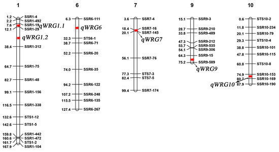 Locations of QTLs for the whiteness of rice grain (WRG) in the chromosomal segment substitution line (CSSL) populations across two environments. DNA markers with genetic distances (in centimorgans) are displayed along each chromosome. QTLs for WRG, including qWRG1.1, qWRG1.2, qWRG6, qWRG7, qWRG9, and qWRG10, are indicated by red markers.