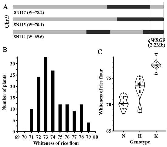 Contig mapping of qWRG9 and frequency distributions of the whiteness of rice grain (WRG) in the BC4F2 population. (A) Localization of qWRG9 on chromosome 9, based on introduced chromosomal segments in chromosome segment substitution lines (CSSLs) SN114, SN115, and SN117. The whiteness values (W) of each line are indicated in parentheses. (B) Frequency distribution of WRG in the BC4F2 population. (C) Comparison of WRG among genotypes: N indicates rice lines with the homozygous qWRG9 allele from NONA. H indicates rice lines with the heterozygous qWRG9 allele, and K indicates rice lines with the homozygous qWRG9 allele from KOS.