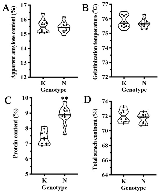 Rice grain quality traits in individuals with different qWRG9 genotypes. (A) Apparent amylose content (%) in rice lines carrying the homozygous qWRG9 allele from Koshihikari (K) and Nona Bokra (N). (B) Gelatinization temperature (°C) of rice starch in K and N genotypes. (C) Protein content (%) in K and N genotypes, showing a significant increase in individuals carrying the qWRG9 allele from NONA (** p < 0.01). (D) Total starch content (%) in K and N genotypes.