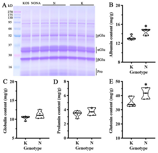 The comparison of protein components of milled rice with different qWRG9 genotypes. (A) SDS-PAGE profiles of total storage from three representative rice flours in K and N genotypes, respectively. (B–E) The albumin, globulin, prolamin, and glutelin contents of five representative milled rice flours in K and N genotypes, respectively (* p < 0.05).