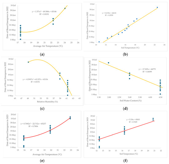 According to the results for 2023 (Table 6), the date of shoot emergence (DOE) correlated positively with average air temperature, average maximum air, and minimum air temperature (0.569**, 0.575**, 0.577**). The total number of shoots (TOS) was negatively correlated with soil temperature; however, no correlation with air temperature was observed. Total number of shoots (TOS) and the number of surviving shoots were negatively correlated with average air temperature (−0.449**, −0.424**), maximum air temperature (−0.446**, −0.421**), minimum air temperature (−0.445**, −0.420**), and soil temperature (−0.582**, −0.471**) but were positively correlated with soil water content (WC50) (0.590**, 0.480**). The survival rate (SR) was positively correlated with all air temperature and soil temperature parameters (0.381*, 0.378*, 0.377*, 0.670**) in our study and negatively correlated with soil water content (−0.628**). Similarly, shooting period (SHP) was also observed to be in negative correlation with average air temperature (−0.509**), average maximum air temperature (−0.507**), average minimum air temperature (−0.506**), and soil temperature (−0.472**), while there was a positive relationship with soil water content (0.507**).