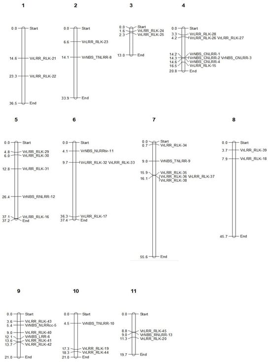 It was found that the maximum number of genes (seven) was present on Ch.4, i.e., three NBS-CNLRR and four LRR-RLK genes, whereas Ch.2 consisted of only one R-gene (VrNBS_TNLRR-8). The LRR-RLK genes were unevenly distributed across all 11 chromosomes. However, NBS-TNLRR genes were mapped on Ch.2 and Ch.7.