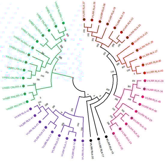 Phylogenetic tree of different LRR and LRR-RLK genes by adopting maximum livelihood model with bootstrap value n = 1000 using MEGA 11.0.