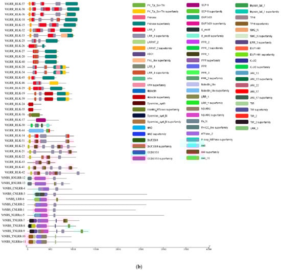 Significant structural diversity was observed among the candidate R-genes retrieved in the present study. VrNBS-LRR-6 was the longest gene at 18 kb, in which about 12 kb comprised the intronic region. This gene had the longest intronic region containing an untranslated region (UTR) of about 98% of its gene structure followed by VrLRR_RLK-26, VrNBS_TNLRR-7, and VrNBS_TNLRR-9. In the domain architecture, “PRR_3 superfamily” was identified in the majority of protein structures of different R-proteins (Figure 3). The “spermine synthase domain” was found only in the gene VrLRR-RLK-44, whereras the “LRR_8 domain” was found to be conserved in most of the R-proteins. Likewise, “Pkinase domain” was present in VrLRR-RLK-37, VrLRR-RLK-38, VrLRR-RLK-36, VrLRR-RLK-46, VrLRR-RLK-28, VrLRR-RLK-34, VrLRR-RLK-19, and VrLRR-RLK-39. Additionally, the “TPH superfamily” was present in two candidates, i.e., VrNBS-TNLRR-10 and VrNBS-NLRR-11.