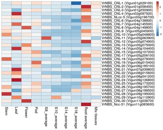 The different rows show various R-genes, and columns represent expression in different organs of the plant. In the stem, the maximum expression of 34.63 was shown by the gene VrNBS_CN-22, followed by VrNBS_CN-10 (16.95) and VrNBS_CN-10 (16.49); the minimum expression of the respective genes is represented by green blocks. In the leaf, VrNBS_CN-22 showed the maximum expression of 45.10, which is depicted by red color; the second largest expression was shown by VrNBS_CNL-4, showing expression of 40.45, and the minimum expressions were seen in VrNBS_CN-30, VrNBS_Ncc-31, VrNBS_CN-28, VrNBS_CN-16, and VrNBS_CNL-2, which had no expression. VrNBS_CN-22 showed the maximum expression (24.31) in the flower. The range of gene expression in the pod was from 0 to 24.31 in VrNBS_CNL-3 and VrNBS_CNL-2, respectively. In the case of roots, the maximum expression was seen in VrNBS_CNL-3 (34.48). The genes VrNBS_CN-24, VrNBS_CN-28, VrNBS_CN-29, VrNBS_CN-30, VrNBS_CN-3, VrNBS_CNL-2, VrNBS_CN-11, VrNBS_CN-12, VrNBS_CN-13, VrNBS_CN-14, and VrNBS_CN-16 showed minimum expression in all tissues, whereas VrNBS_CN-3, VrNBS_CN-22, and VrNBS_CN-27 showed more than average expression.