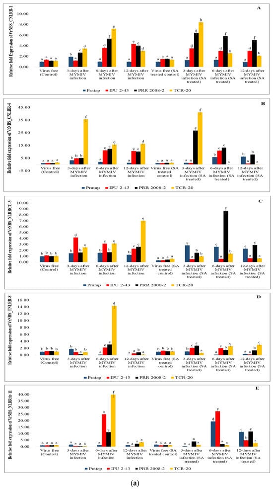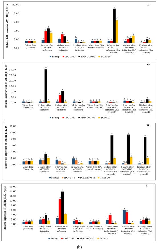 A total of 12 representative candidate genes including LRRs and LRR-RLKs (Figure 6a–c) were subjected to gene expression profiling to understand the pattern of gene expression regulated by SA upon MYMIV infection. In VrNBS_CNLRR-1, all the genotypes showed variable expression in both control and SA treatment conditions. For VrNBS_NLRRcc-5, expression in all the genotypes was noticed in the control condition, but under the SA treatment conditions, the level of expression was increased 9-fold in PRR-2008-2 at 6-DAI, and at the rest of the time points, the expression was similar for all four genotypes. The expression of VrNBS_TNLRR-8 was also found to increase in SA treatment conditions in comparison to control conditions. In the case of VrNBS_NLRRtir-11, expression was seen at 6-DAI in IPU2-43, PRR-2008-2, and TCR-20 under control conditions, but after SA treatment, expression was seen in Pratap at 6-DAI (20-fold) and 12-DAI (15-fold). For VrLRR-RLK-16, expression reached the maximum at 3-DAI for all the genotypes but decreased at 6-DAI and 12-DAI under controlled conditions; however, for VrLRR-RLK-16 (SA-treated), expression was decreased. For VrLRR_RLK-30 (H2O), all the genotypes showed expression at all time points, but under salicylic acid treatment conditions, it decreased after 3-DAI in all four genotypes in VrLRR_RLK-30 (SA). For the VrLRR_RLK-18 gene, Pratap, IPU2-43, PRR-2008-2, and TCR-20 all showed expression under H2O spraying conditions, whereas a similar relative expression (10-fold and 5-fold) was seen in PRR-2008-2 and TCR-20, respectively.VrLRR_RLK-31’s gene expression was observed in different genotypes at all time points, but no appreciable level of expression was seen in treatment conditions.